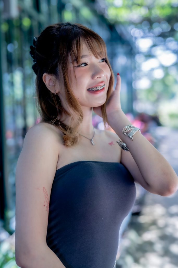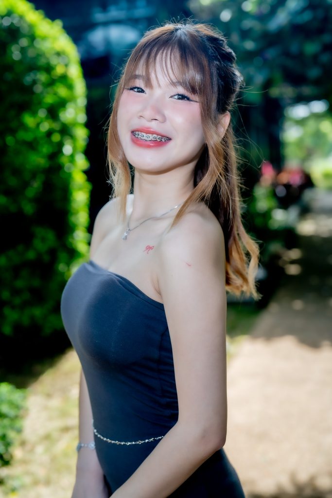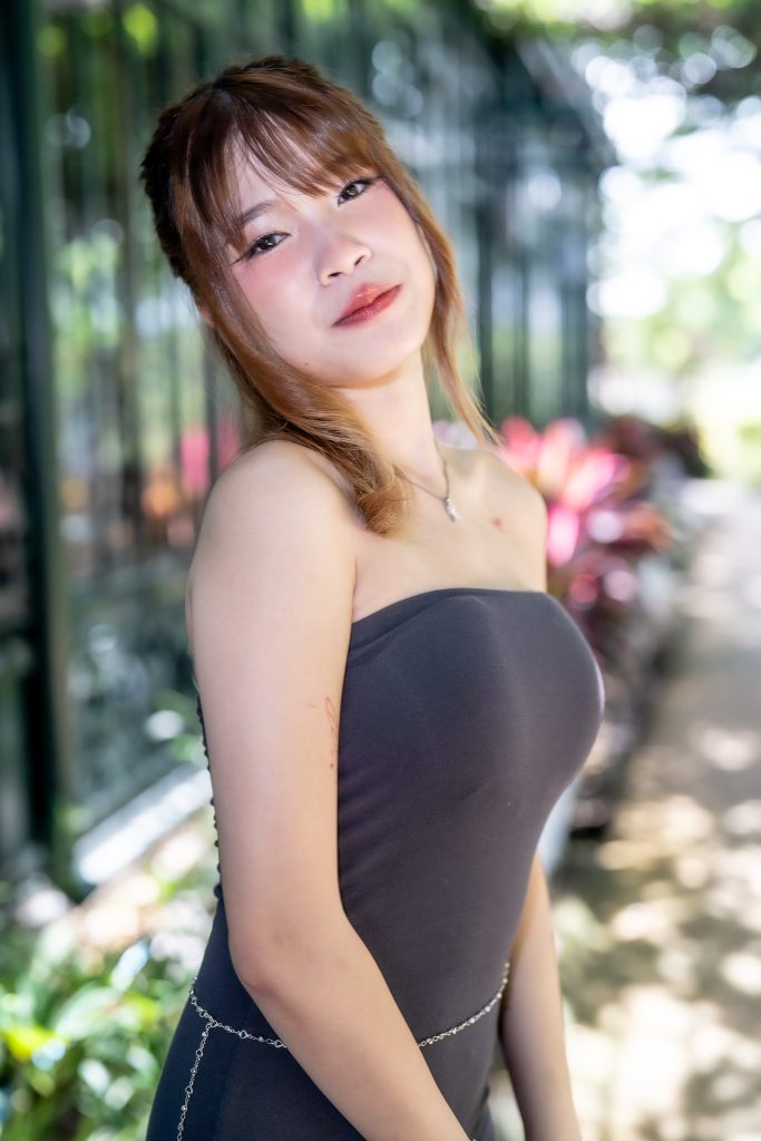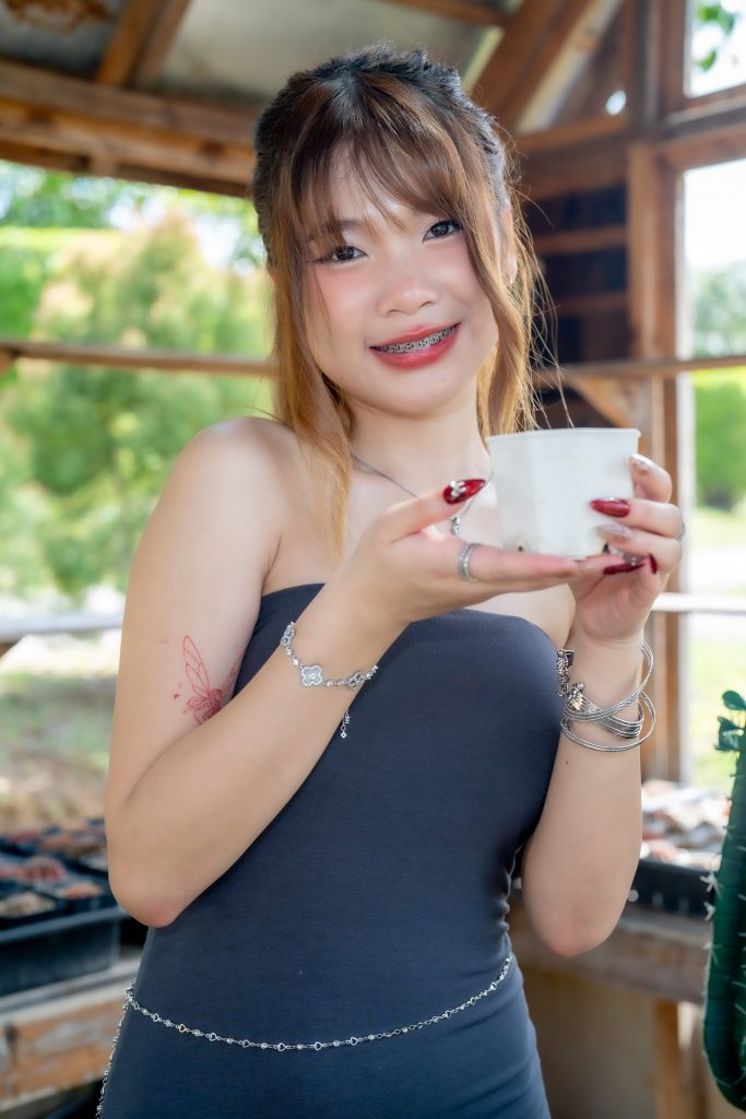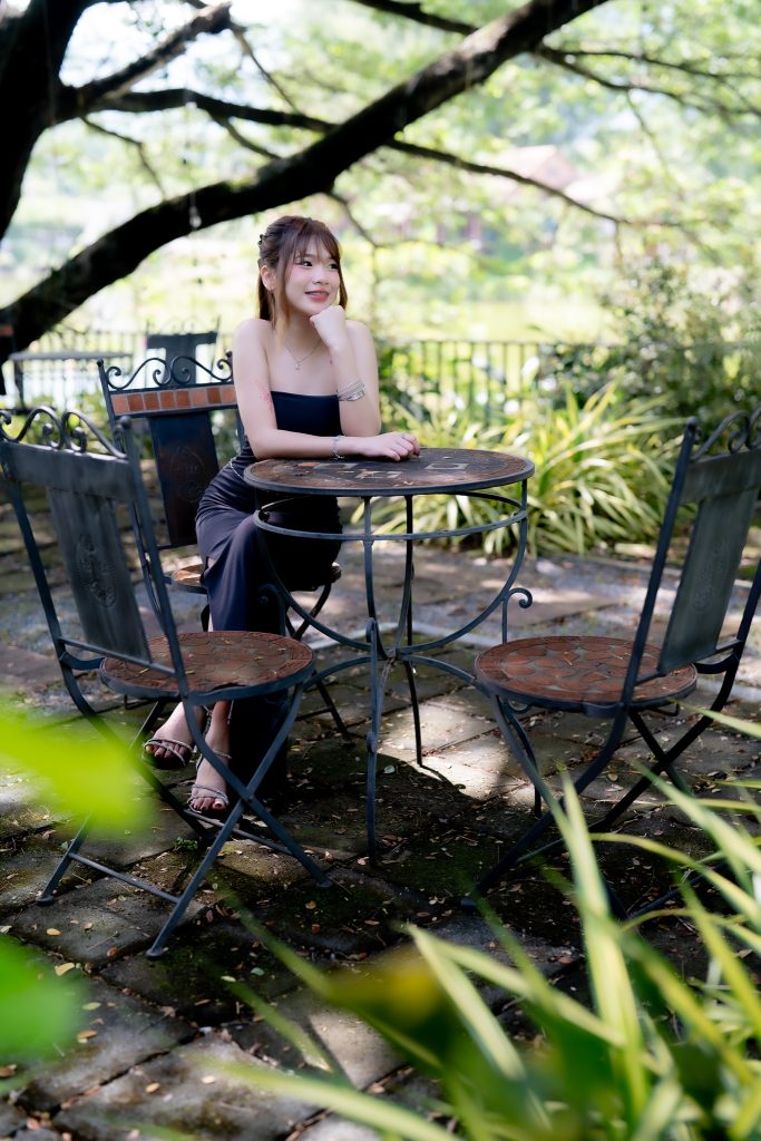 ความโดดเด่นอีกประการอยู่ที่ชุดสวยสีดำที่เธอสวมใส่ ตัดกับฉากหลังเขียวขจีจนเกิดความสมดุลที่น่าหลงใหล รายละเอียดของชุดที่แนบเนื้อยิ่งขับให้บุคลิกของน้องกุ๊งกิ๊งดูสง่างามแต่แฝงด้วยความเป็นกันเอง เธอวางแขนเบา ๆ บนโต๊ะ เหมือนกำลังเชิญชวนให้ผู้ชมร่วมแบ่งปันความเงียบสงบในเช้าวันหยุด แสงที่จับบนเส้นผมและรอยยิ้มเล็กน้อยสร้างความรู้สึกจริงใจและเป็นธรรมชาติ